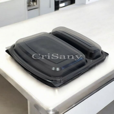 Представяме ви нашата практична и стилна кутия с две отделения, идеална за организиране и транспортиране на храна. Този комплект включва 50 броя черни кутии с прозрачни капаци, предлагащи удобство и професионален вид.